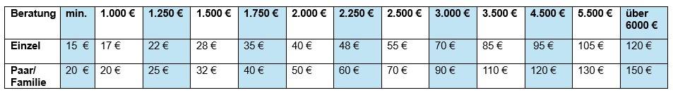- Für weitere Beratungsgespräche erheben wir keine festen Beiträge; wir erwarten aber eine Kostenbeteiligung, die sich nach Ihren Einkommen richtet. Siehe Tabelle unten.